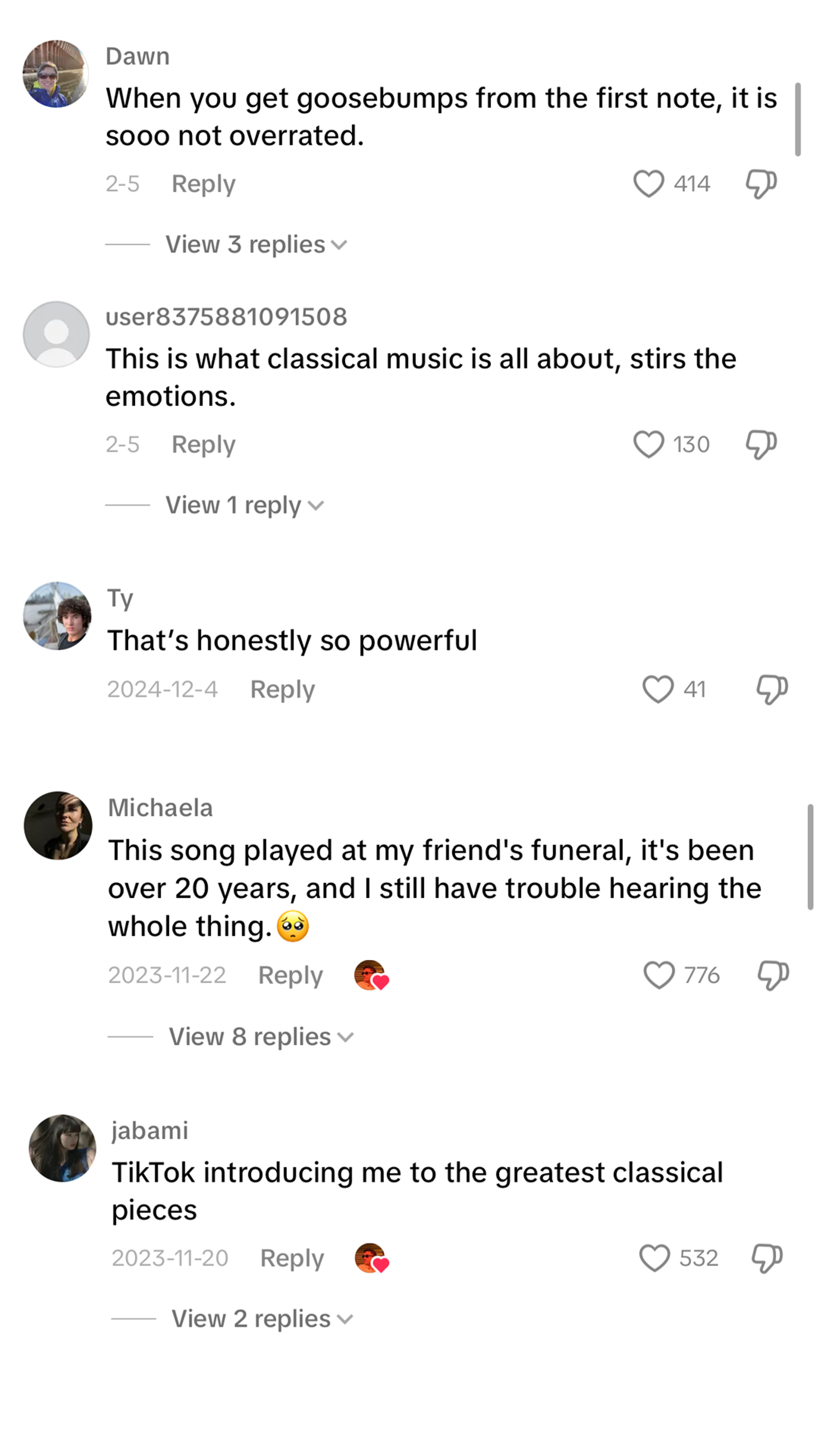 In fact, I’ve been pleasantly surprised to discover that classical music has found a vibrant and enthusiastic audience on TikTok. While many users may not know the names of the pieces they’re hearing or the stories behind them, they express a deep emotional connection to the music. Comments like the ones below are everywhere. It’s proof that the power of classical music transcends knowledge or experience—it speaks directly to the heart.